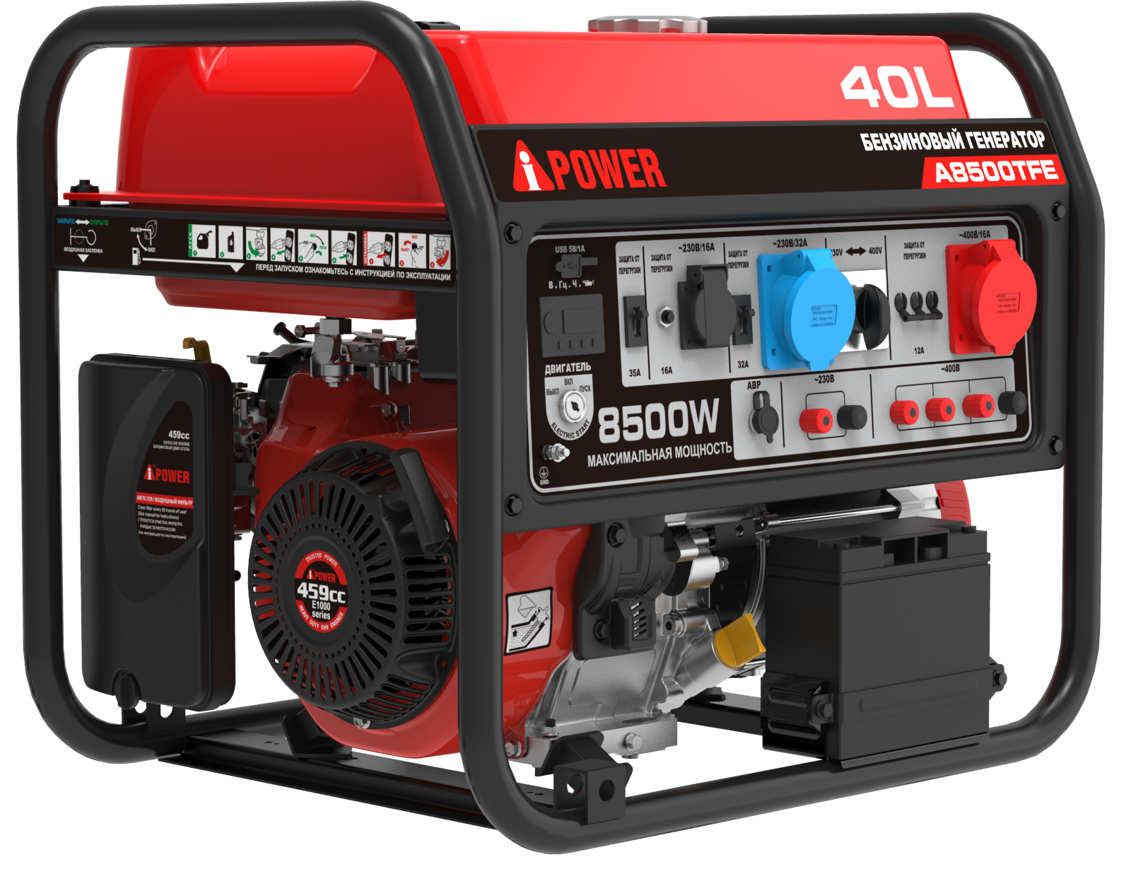 A-iPower A8500TFE оснащен мощным гильзованным 4-тактным OHV-двигателем объемом 459 куб. см с электрическим стартером. На панели управления находится одна стандартная розетка 230В/16А