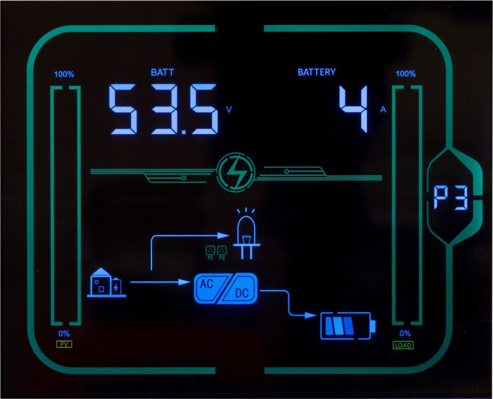 | Перегрузочная способность при работе от электросети | 110-130%: 10сек.,130-150%: 3сек., 150-200%: 200мс, затем ошибка |